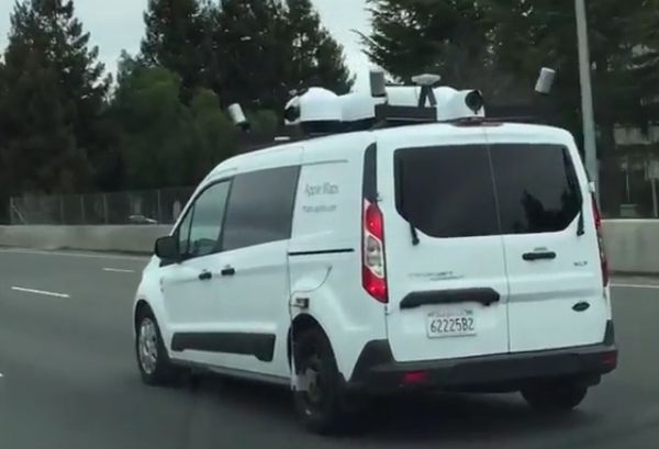 Googleストリートビューを撮影する車には360度撮影できる球体のカメラが取り付けられているが、目撃されているApple Mapsカーは四方にカメラレンズを搭載し、角にはレーダーのような装置を備えたスタイル。